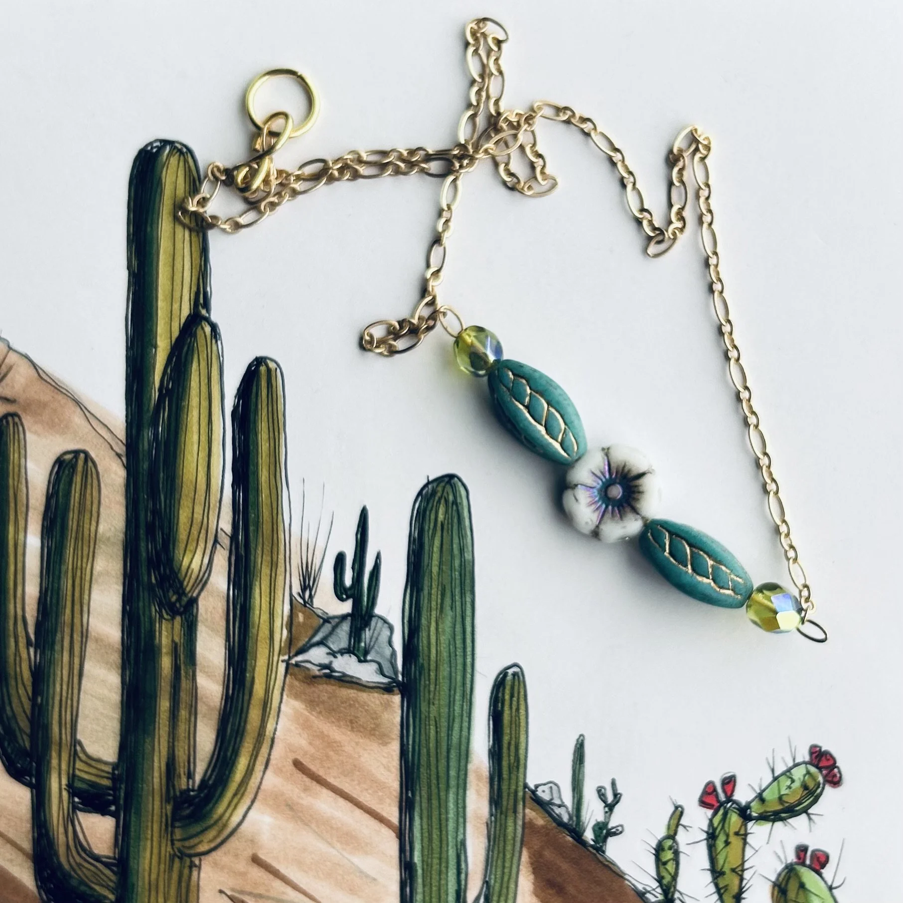 This handmade statement necklace features an impression of a Saguaro flower blossom as the sun rise begins to illuminate the Sonoran desert horizon.