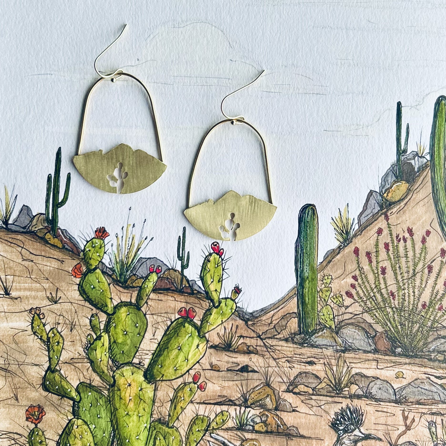 The red hued Camelback Mountain rests proudly in the city of Phoenix. These hand cut brass dangle earrings feature the silhouette of Camelback Mountain as viewed from the south. In the center, the outline of an ancient Saguaro cactus.